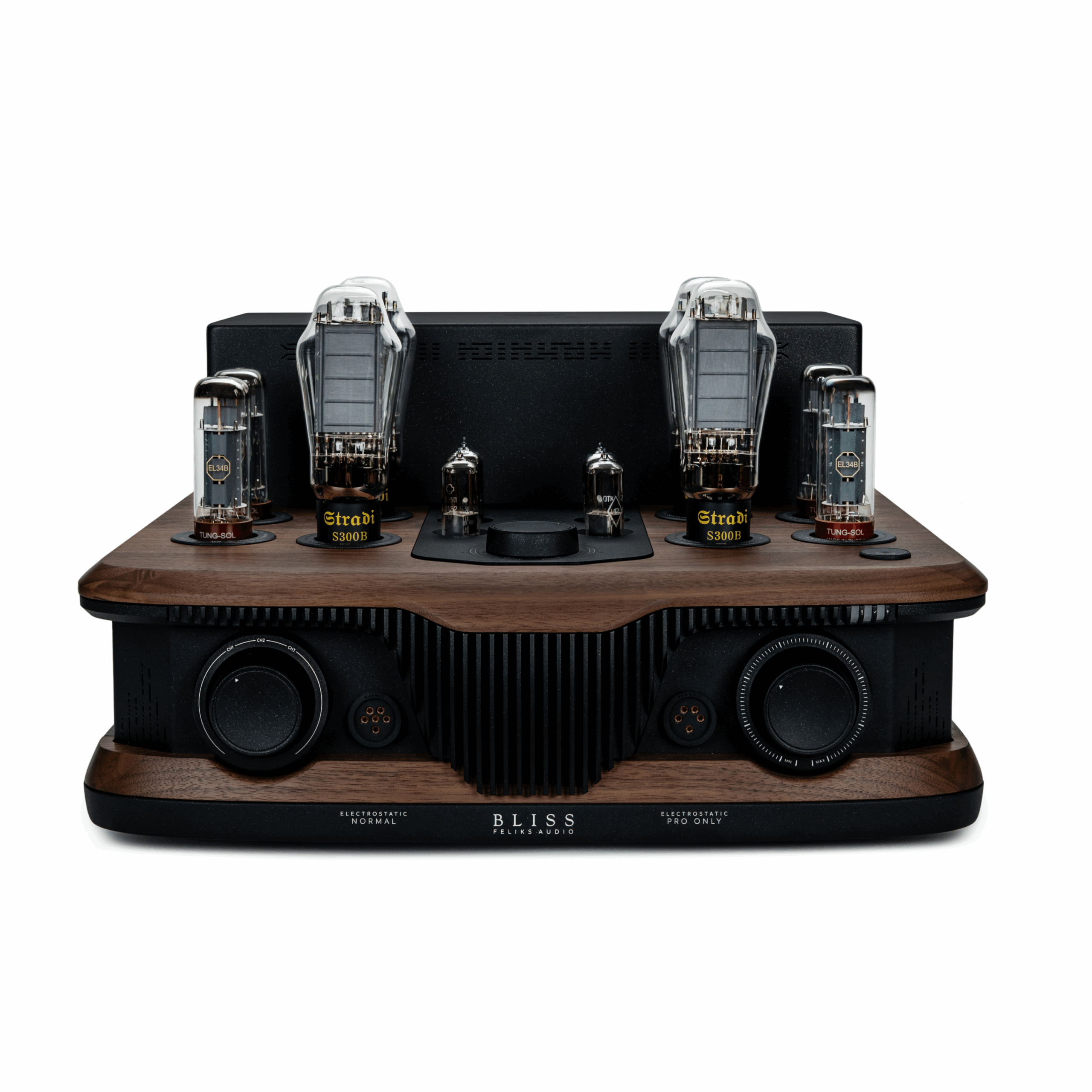 Despite being a purely tube-based design with no output transformers, Bliss achieves exceptionally high gain and outputs up to 1470 V peak-peak. Unlike conventional designs, Bliss employs EL34 tubes as part of its precision current-control architecture. The EL34s are also used to dissipate heat from the amplifier.