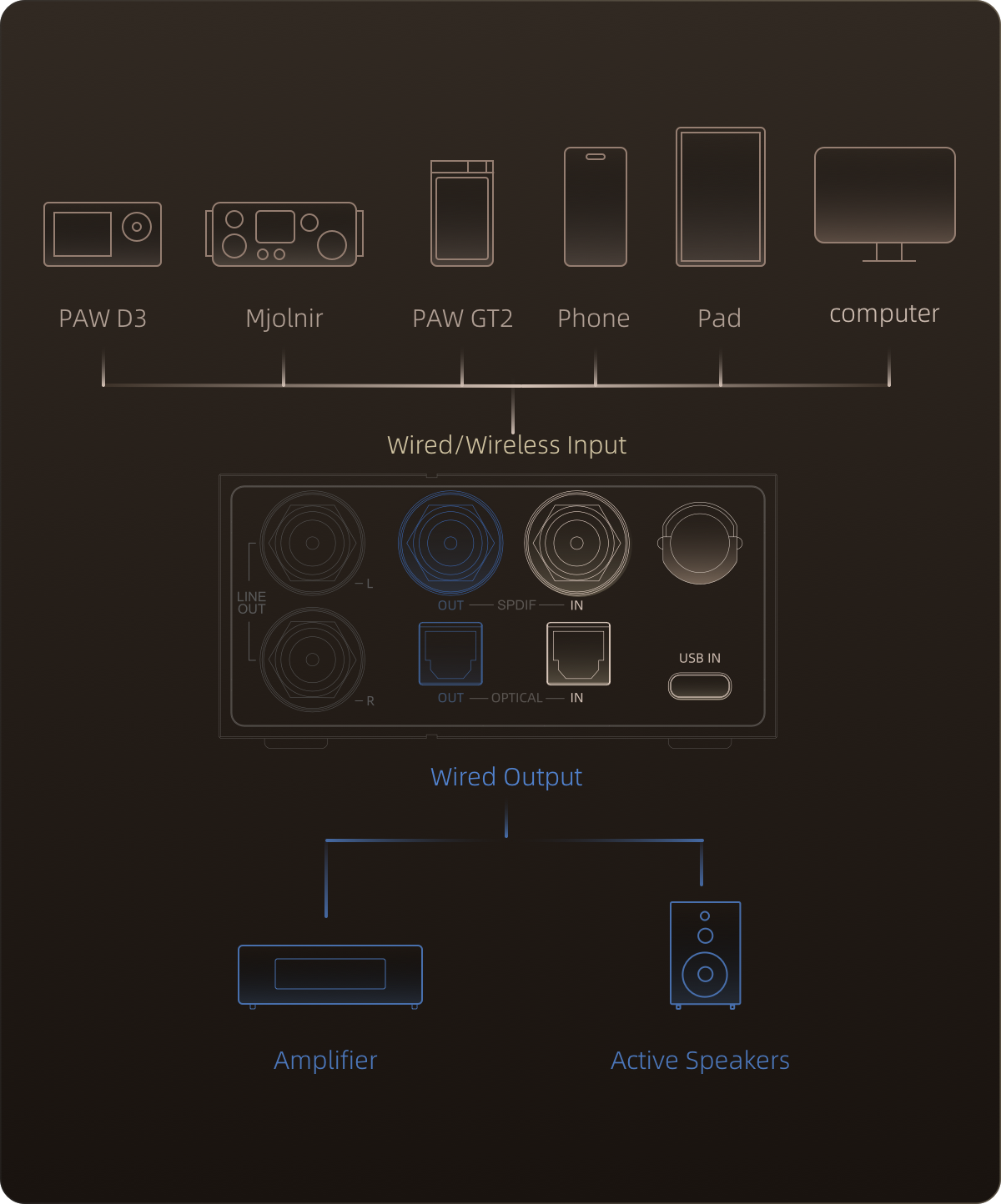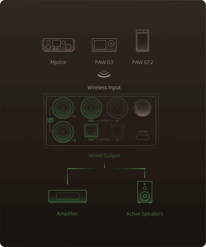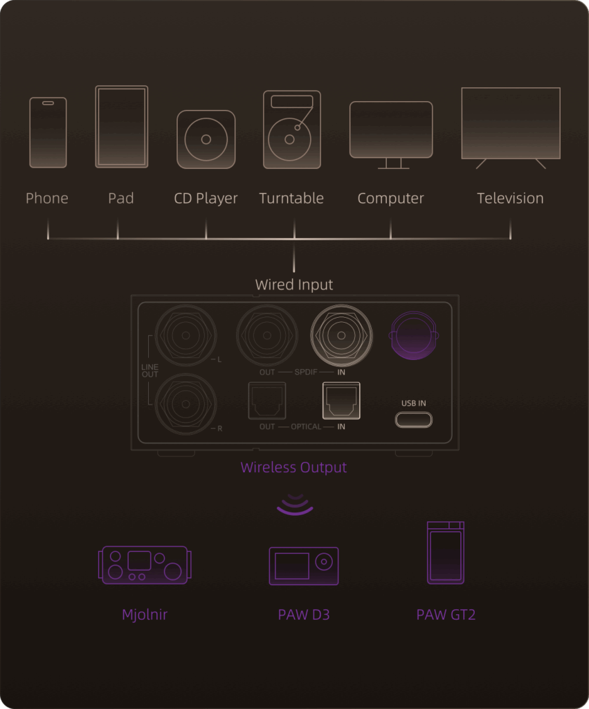 Transmits digital audio signals wirelessly to LTTP-compatible receiving devices (i.e. Lotoo Mjolnir, PAW GT2, PAW D3, etc.). Ideal for wireless, wired desktop audio, or mobile device connections.