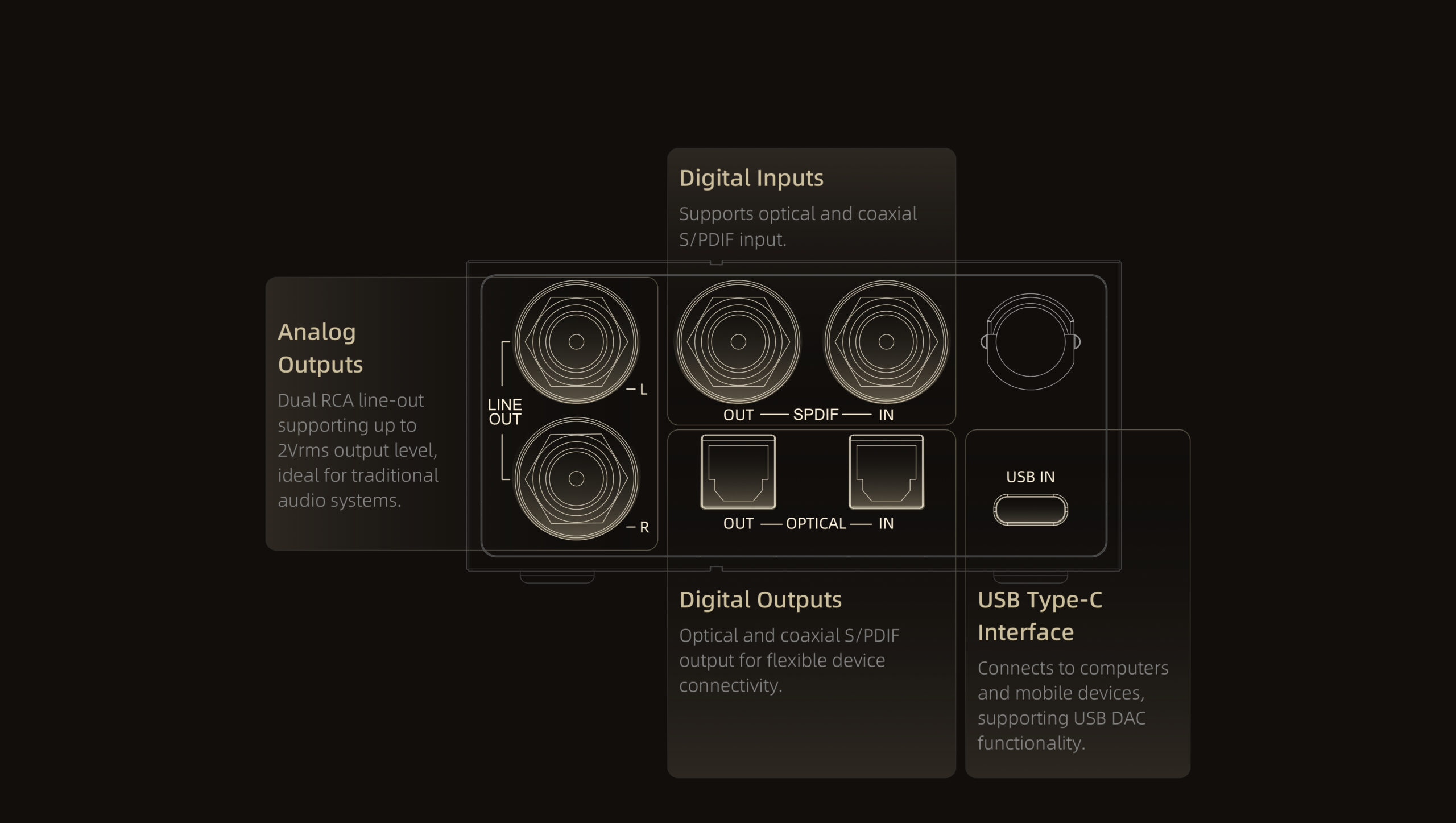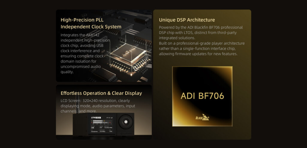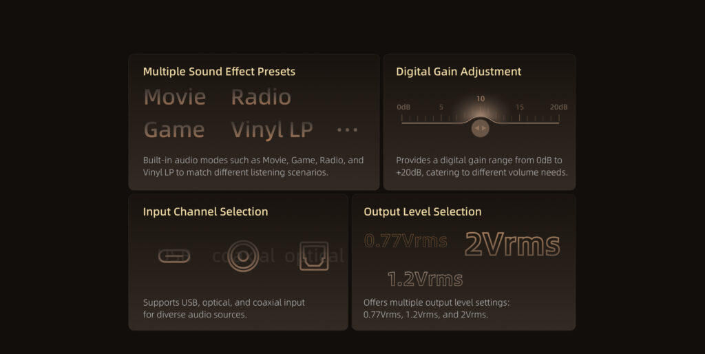 Equipped with an AKM4493EQ high-performance DAC, Receives digital audio via USB or digital inputs (optical/coaxial) and outputs high-quality